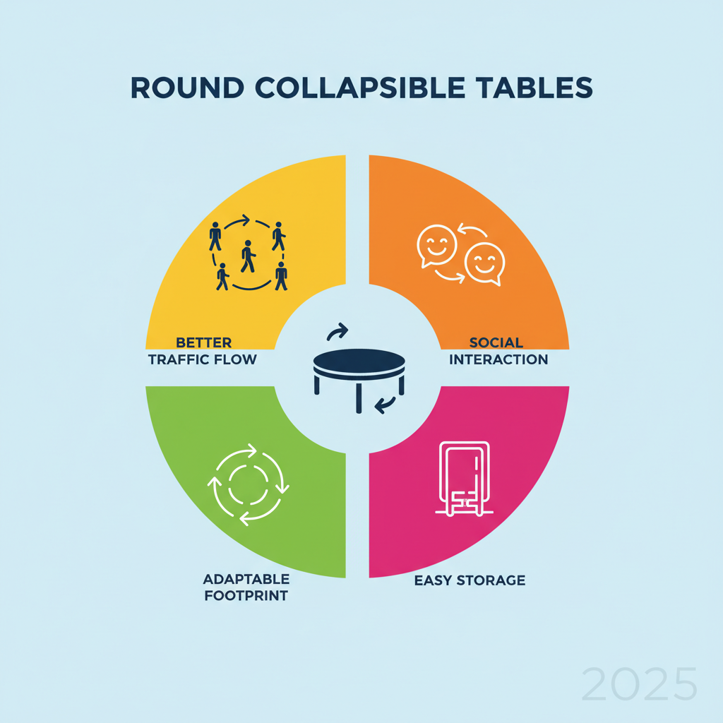 Round collapsible tables are champions of versatility, offering unique advantages over other table shapes, especially in environments where space is a premium. Their design inherently promotes better social interaction and efficient use of floor space.